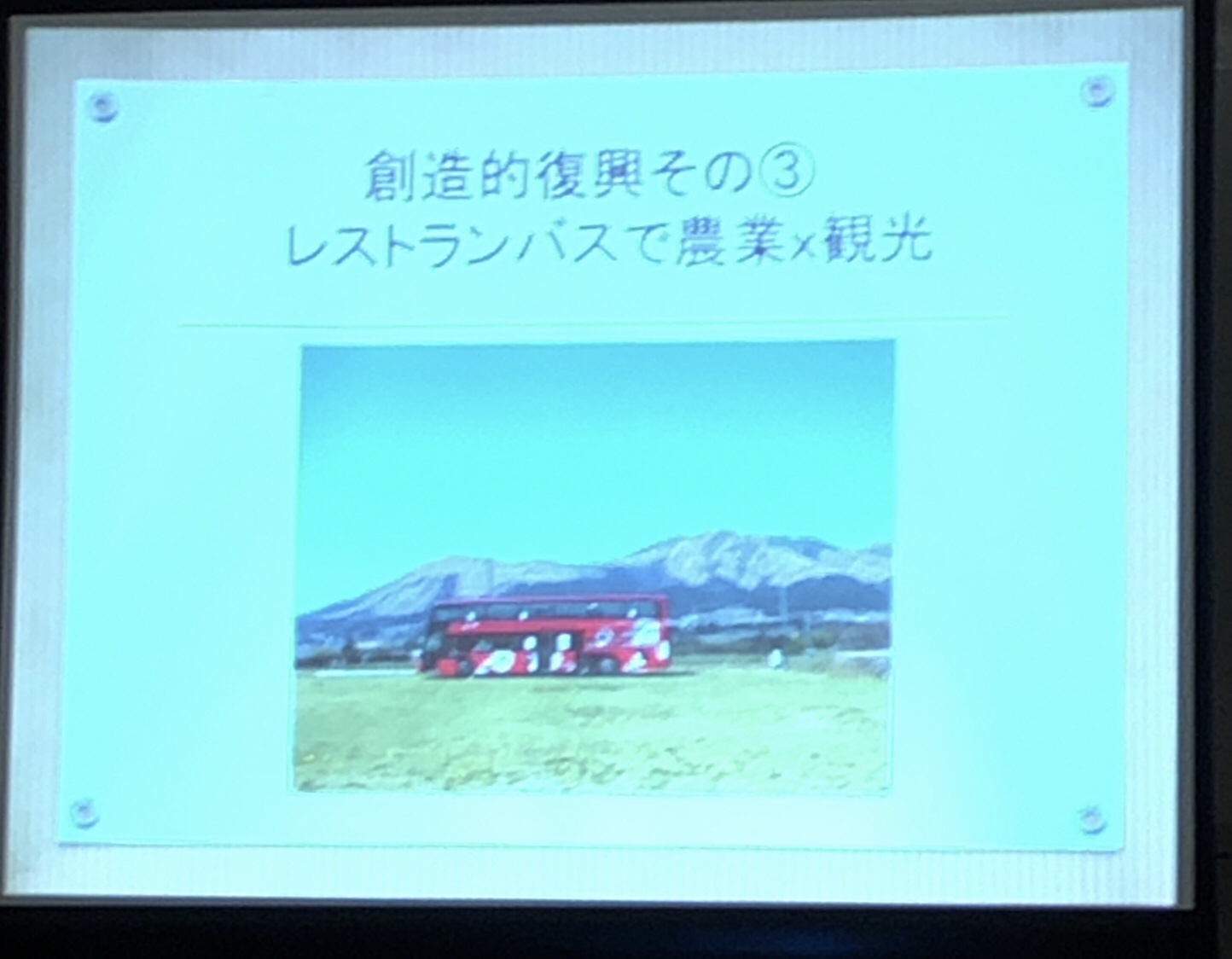 対面式のレストランバスで、阿蘇の素晴らしい景色や農家の方に出向いて、観光したり、その地の食物を使って料理を作ったりと農業と観光の良い融合例だと思います。