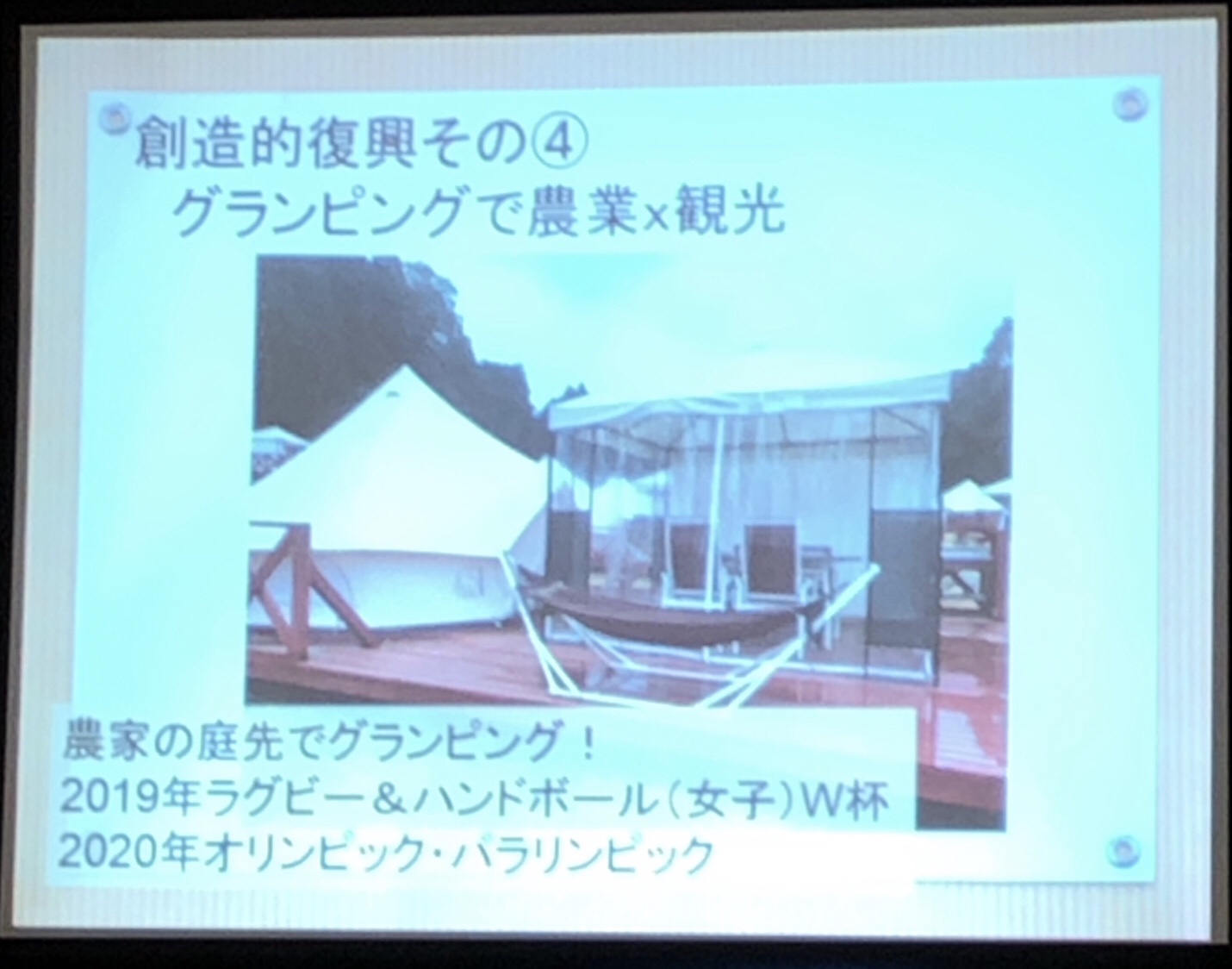 使わない農地を5〜6基作ってグランピングを行うというもの。これは、基礎さえ打たなければ、農地転用は必要ないのだそうです。民泊の一助にもなるし、防災対策や避難訓練にも使えるかもと期待しているそうです。