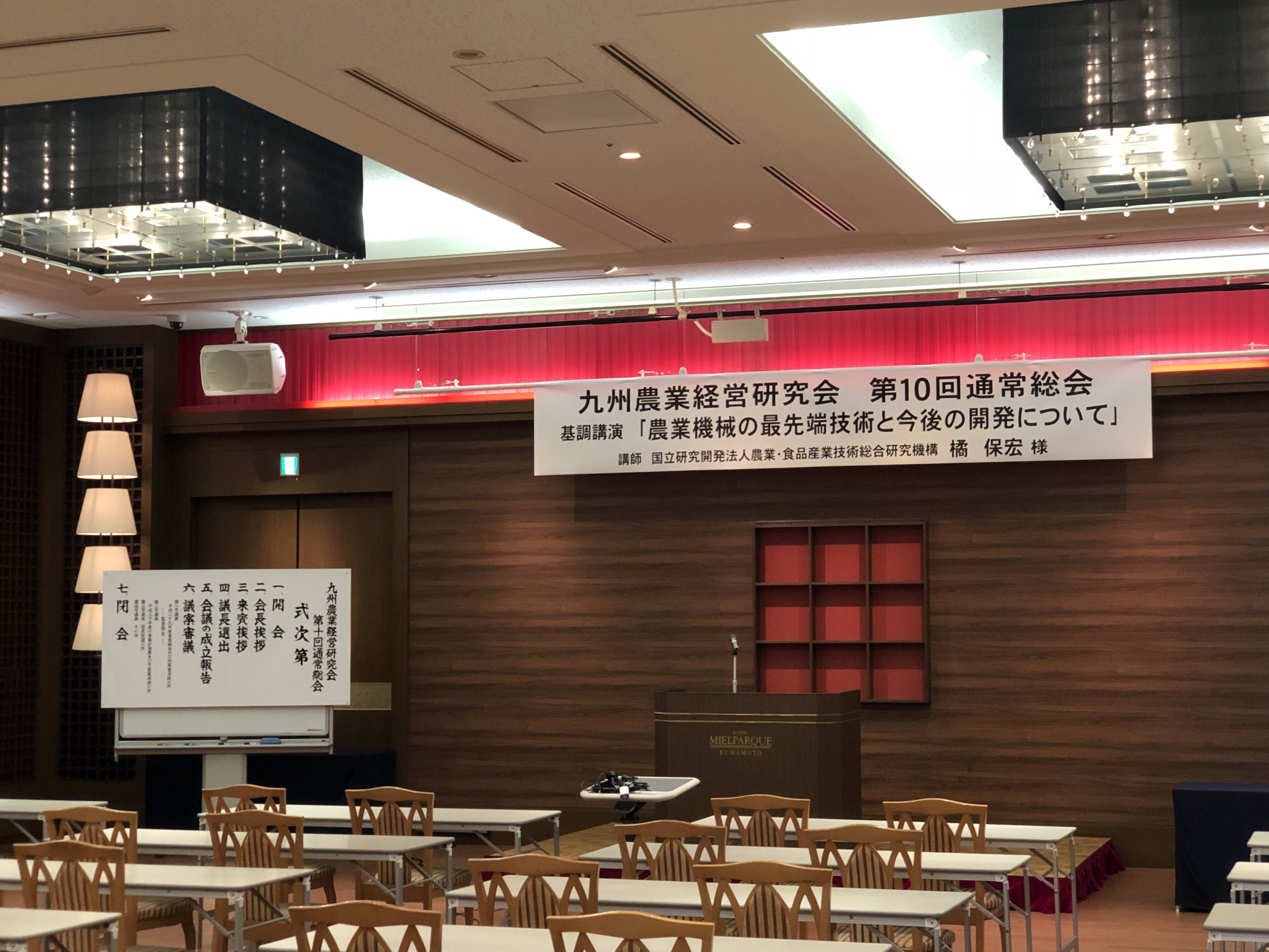 午後からは九州農業経営研究会の通常総会並びに基調講演で橘保宏先生をお招きして、「農業機械の最先端技術と今後の開発について」ご講演いただきました。今のトラクターはスゴイです!無人で動きます。草刈機も普通の車みたいなスピードで走ると草が刈れているという優れものでした。