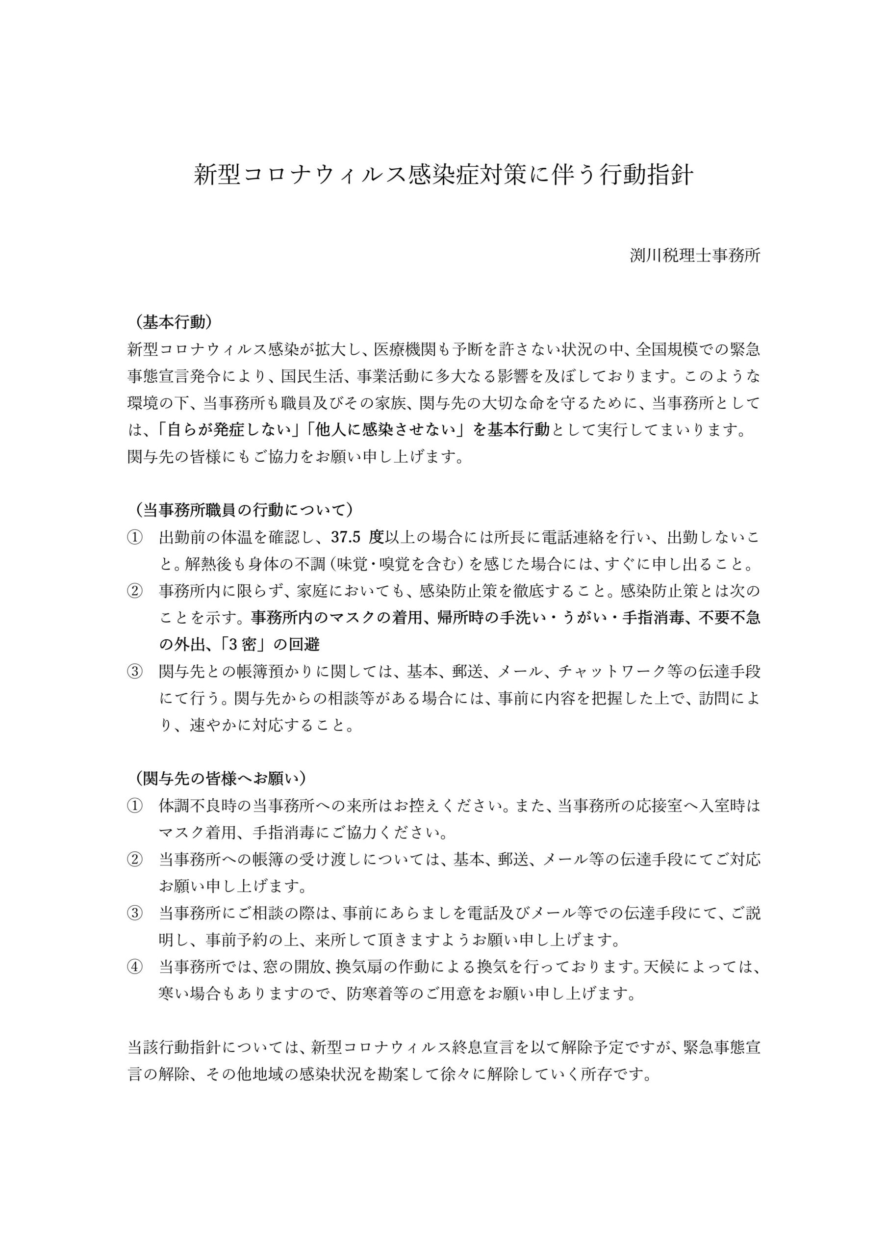 新型コロナウィルス感染が拡大し、医療機関も予断を許さない状況の中、全国規模での緊急事態宣言発令により、国民生活、事業活動に多大なる影響を及ぼしております。このような環境の下、当事務所も職員及びその家族、関与先の大切な命を守るために、当事務所としては、「自らが発症しない」「他人に感染させない」を基本行動として実行してまいります。